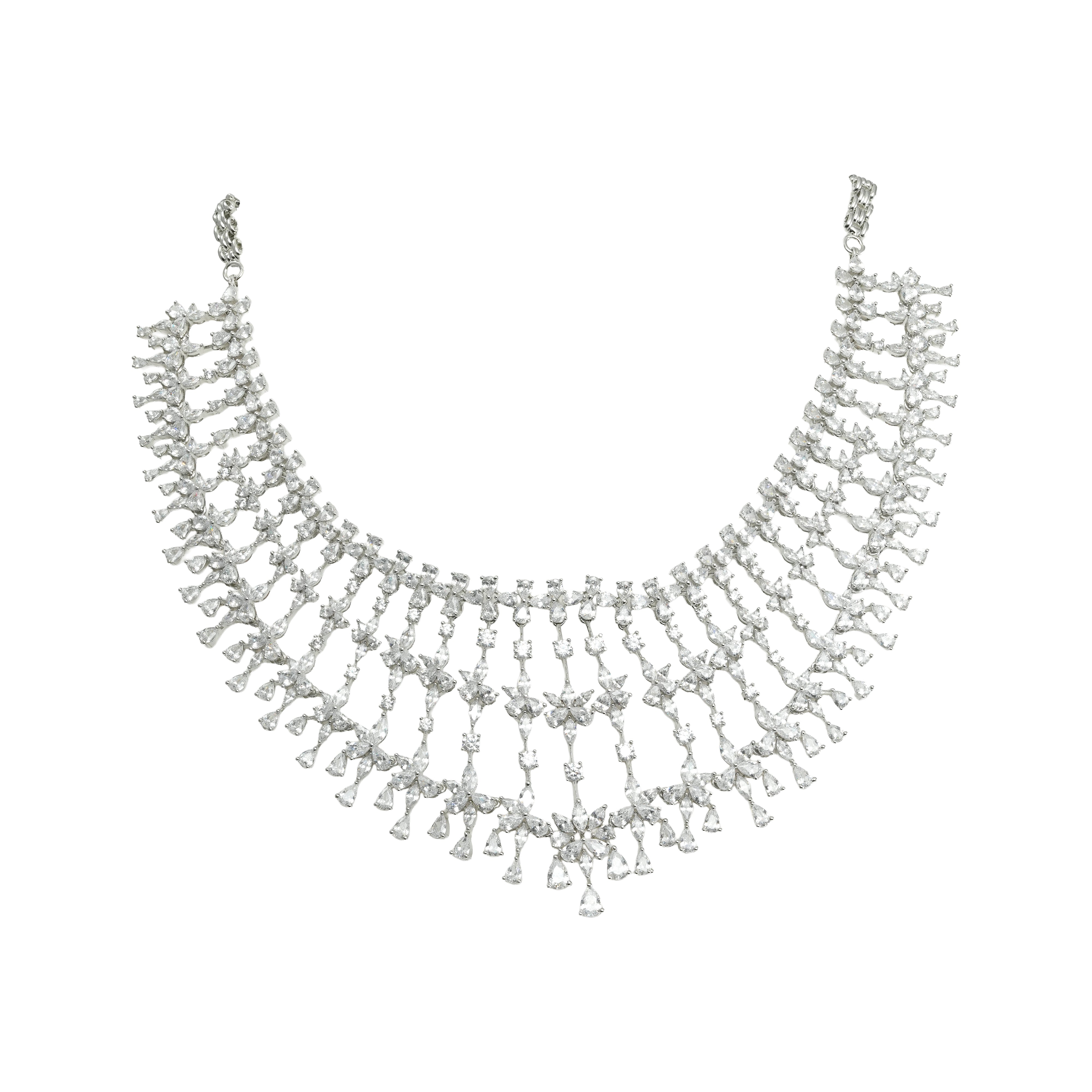 An exquisite interplay of light and movement, the Starlace Necklace Set is crafted to resemble a delicate lacework of diamonds draped gracefully along the neckline. Multiple tiers of shimmering marquise and pear-cut diamonds descend in fluid cascades, creating a dramatic fringe effect that dances with every step.