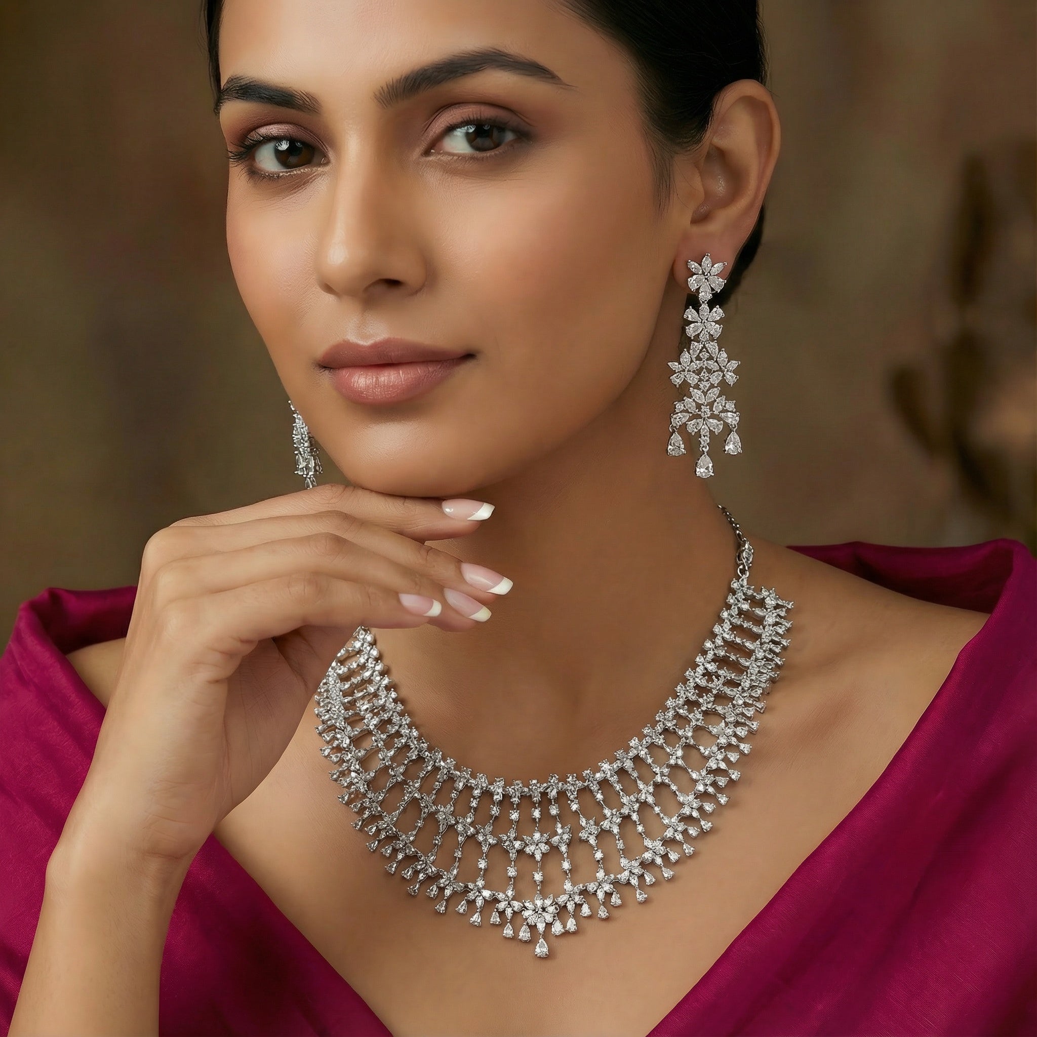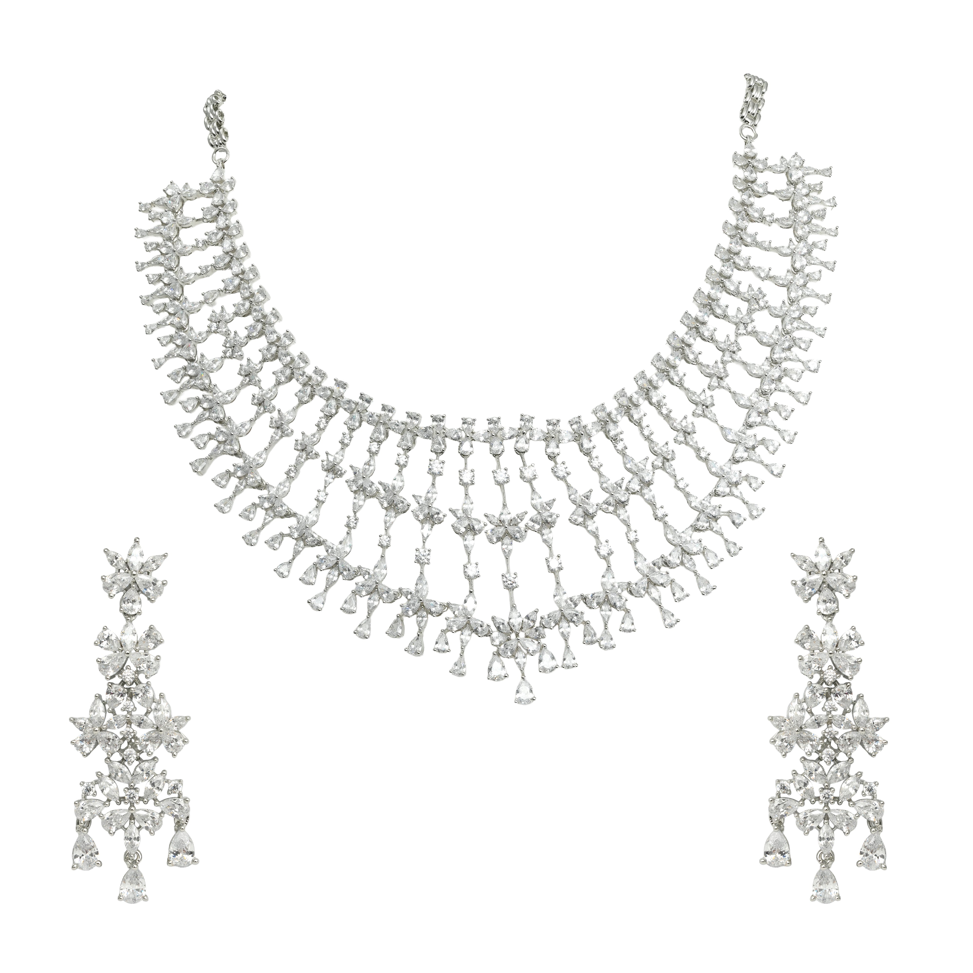 The intricate openwork design lends an airy elegance, while the layered silhouette adds depth and grandeur without heaviness. Complemented by long, chandelier-style earrings echoing the same floral and cascading motifs, this set is designed for moments that call for unforgettable brilliance.