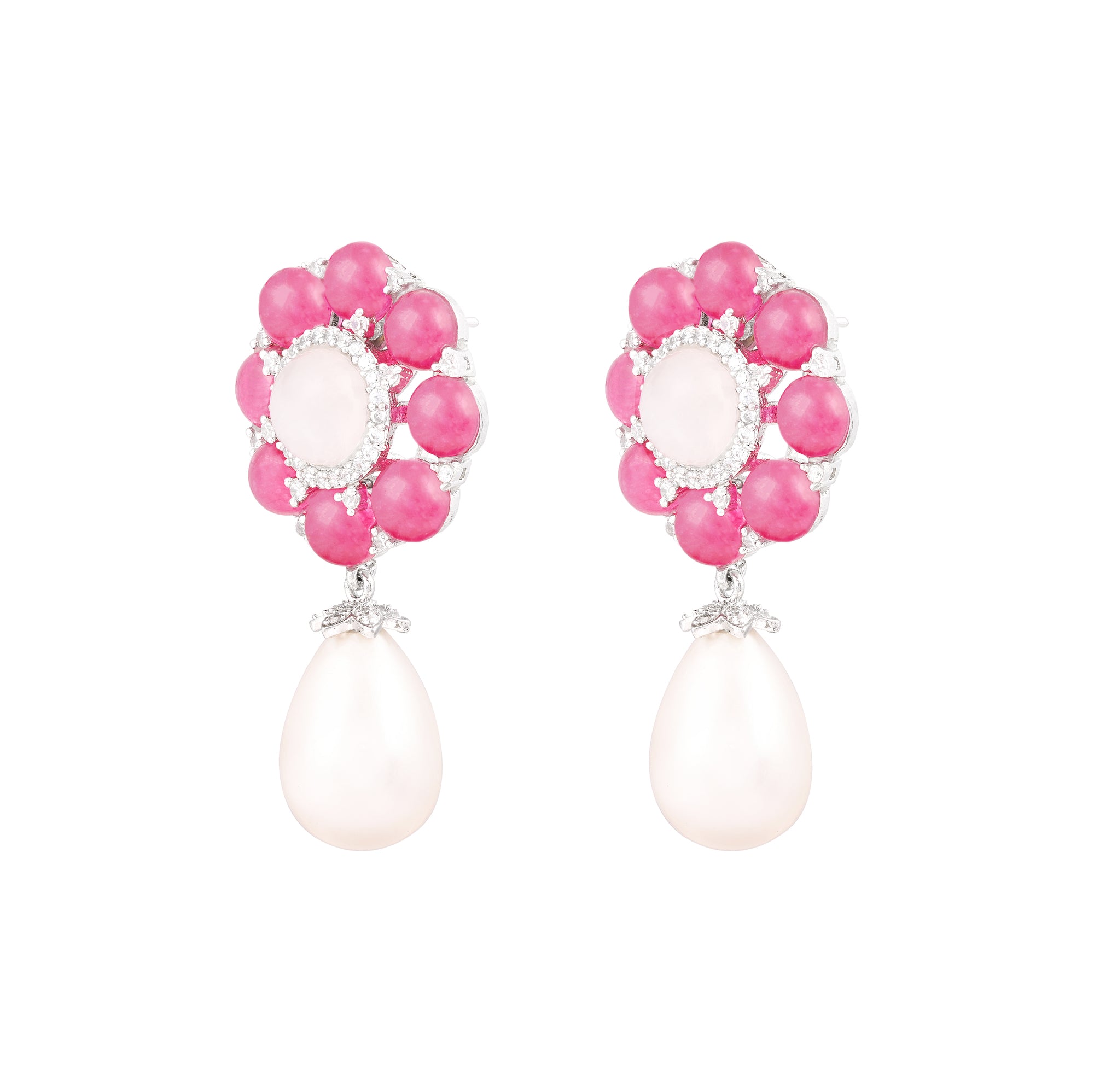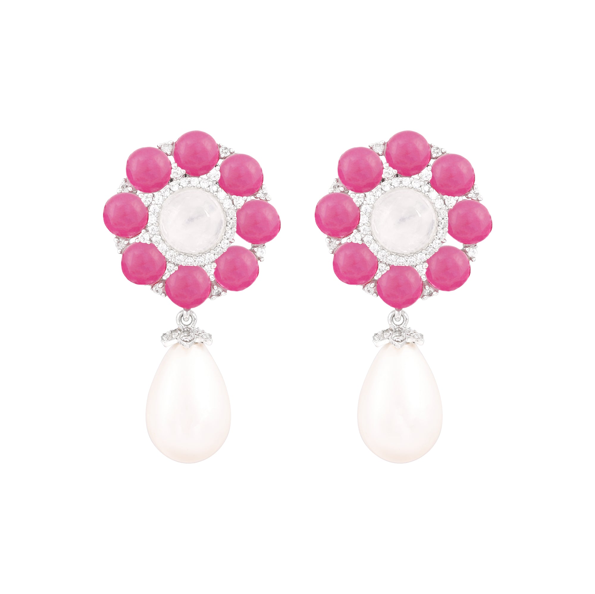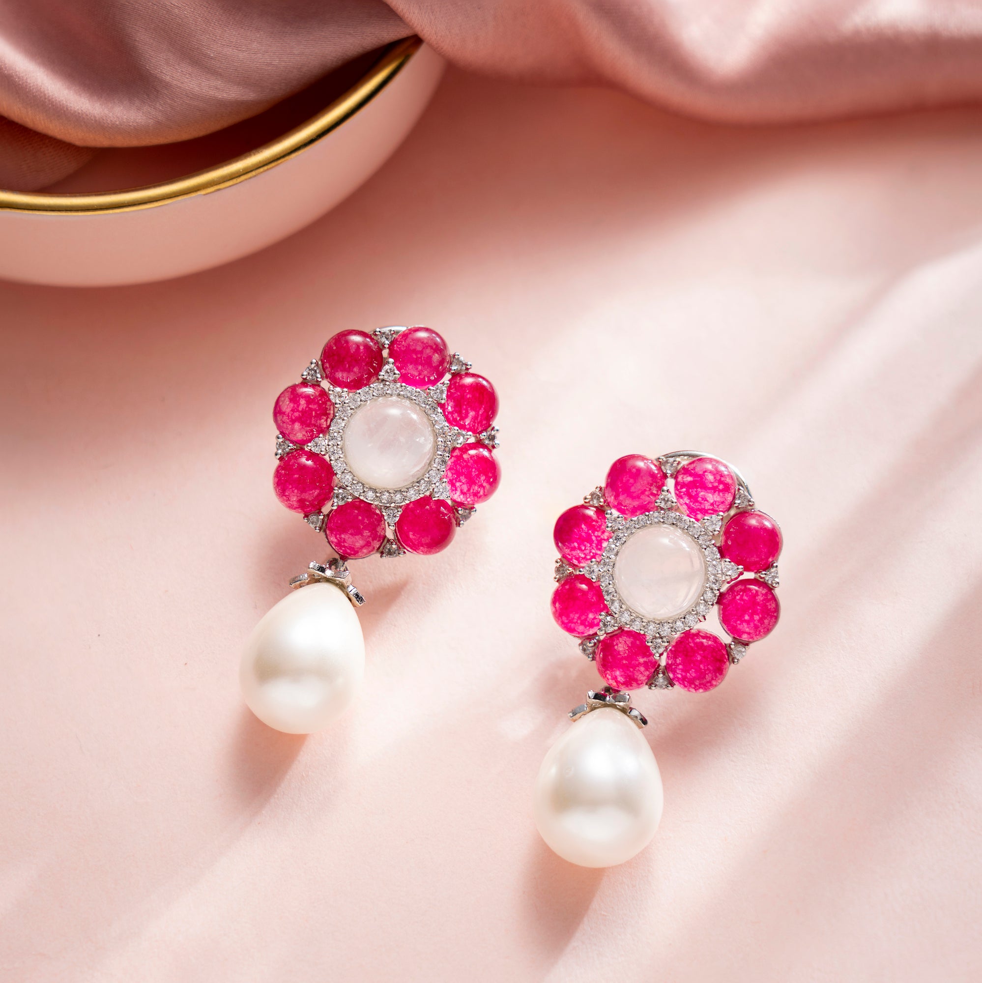 The Blush Fiona Pearl Earrings exude timeless femininity with a modern charm. Designed in a floral motif with vibrant pink stones surrounding a blush pink center, these earrings are finished with a delicate teardrop pearl drop. Graceful and versatile, they make the perfect accessory for weddings, festive occasions, or adding a refined touch to any evening ensemble.
