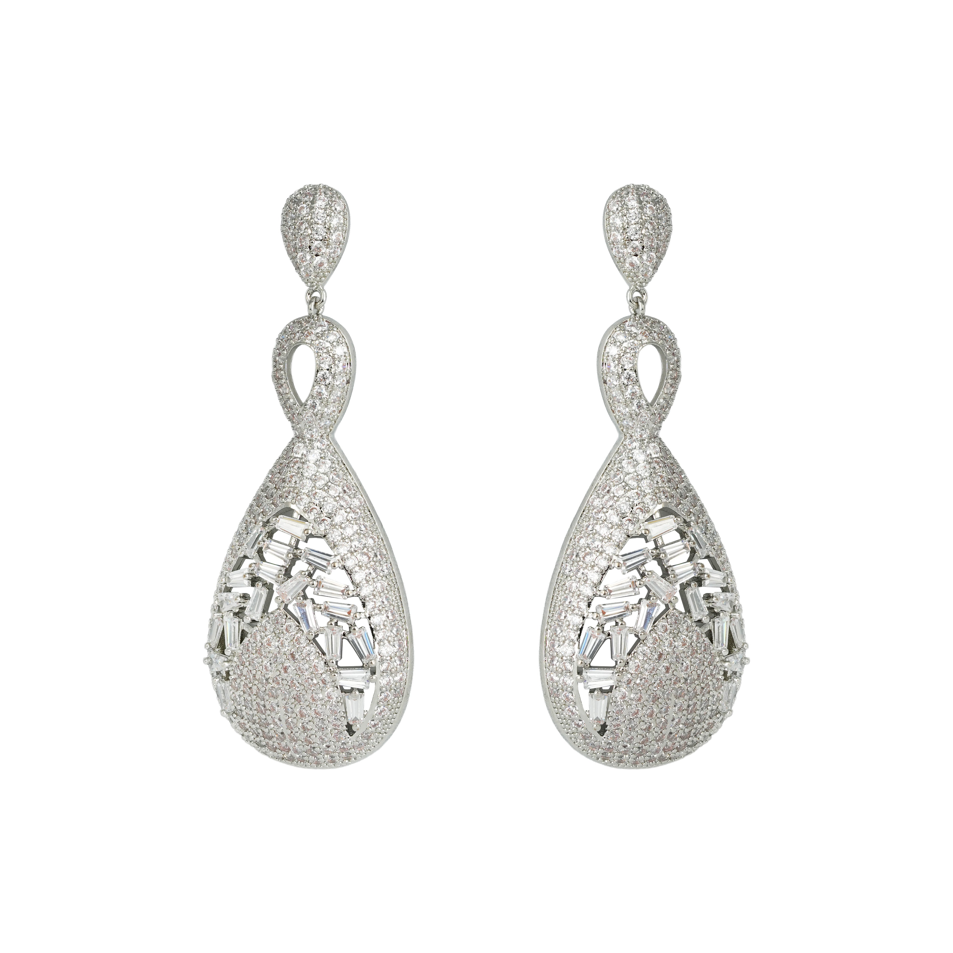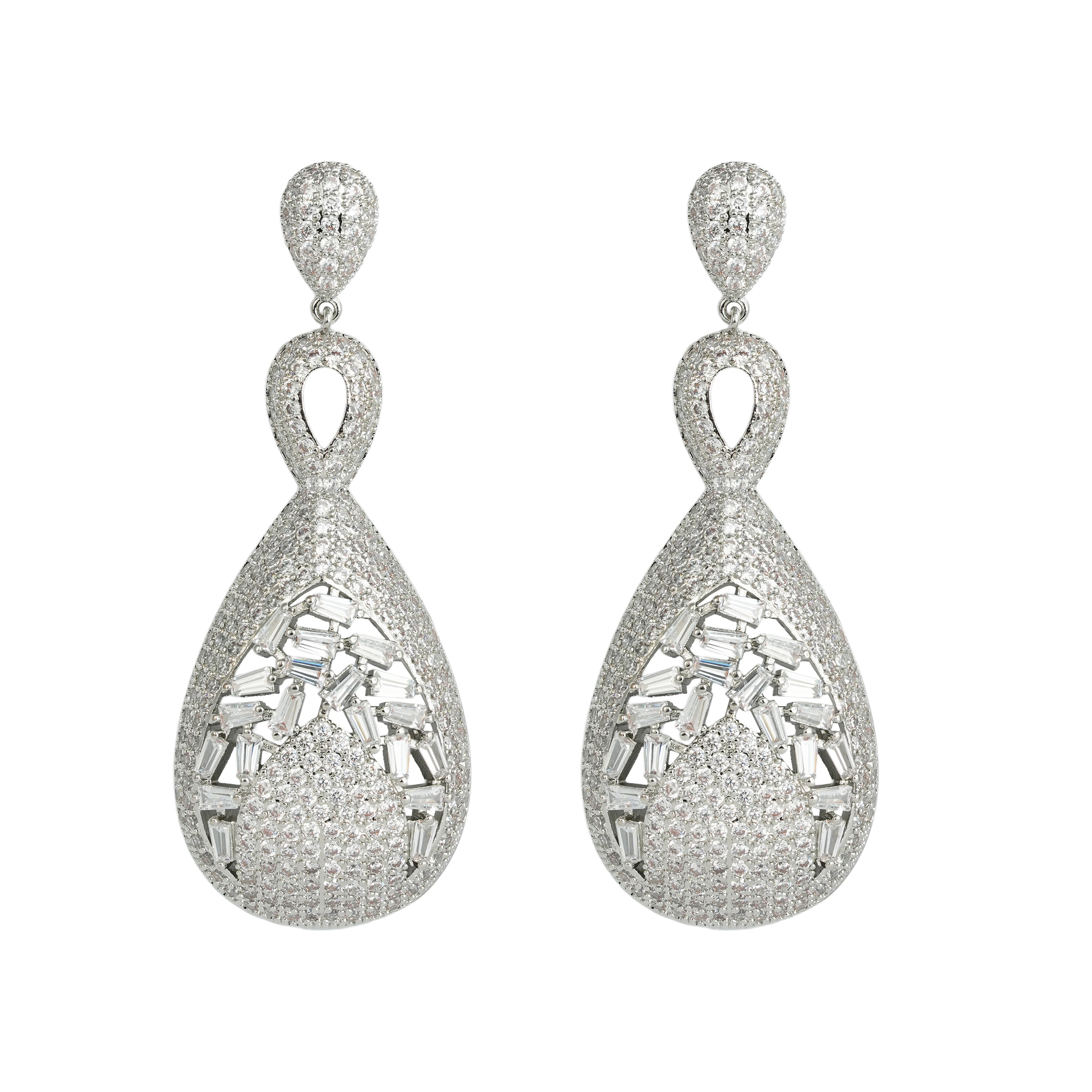 The Donna Lumiere Drops feature a sculpted teardrop silhouette adorned with layers of shimmering diamonds. Intricate pave work and baguette accents create a glowing depth, while the graceful drop design moves like candlelight in a chateau hall. A statement of vintage elegance, these earrings are perfect for soirees, weddings, and heirloom moments.